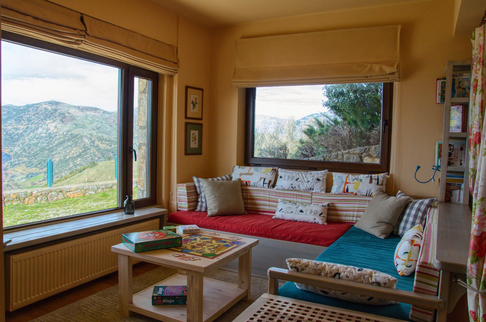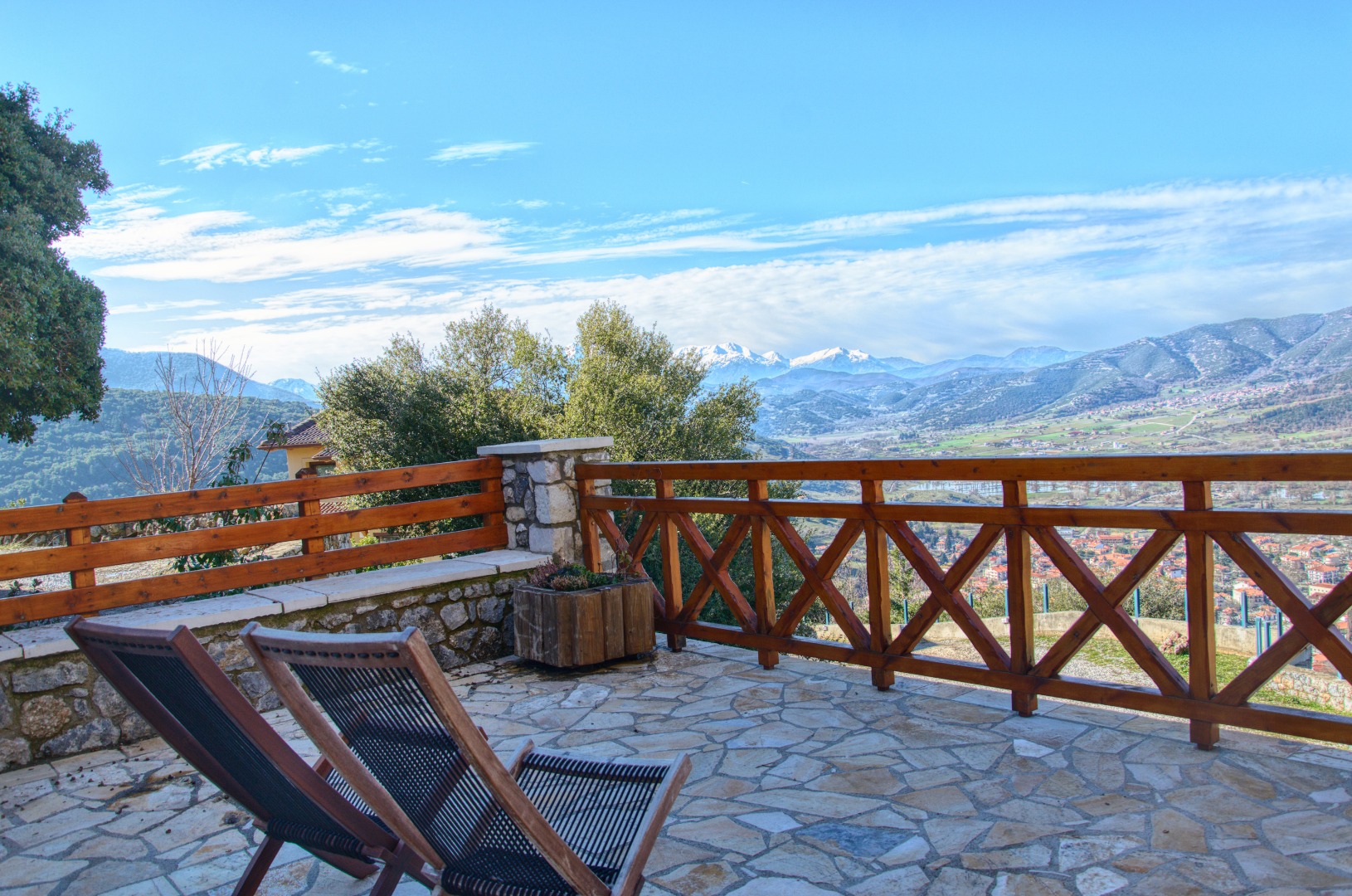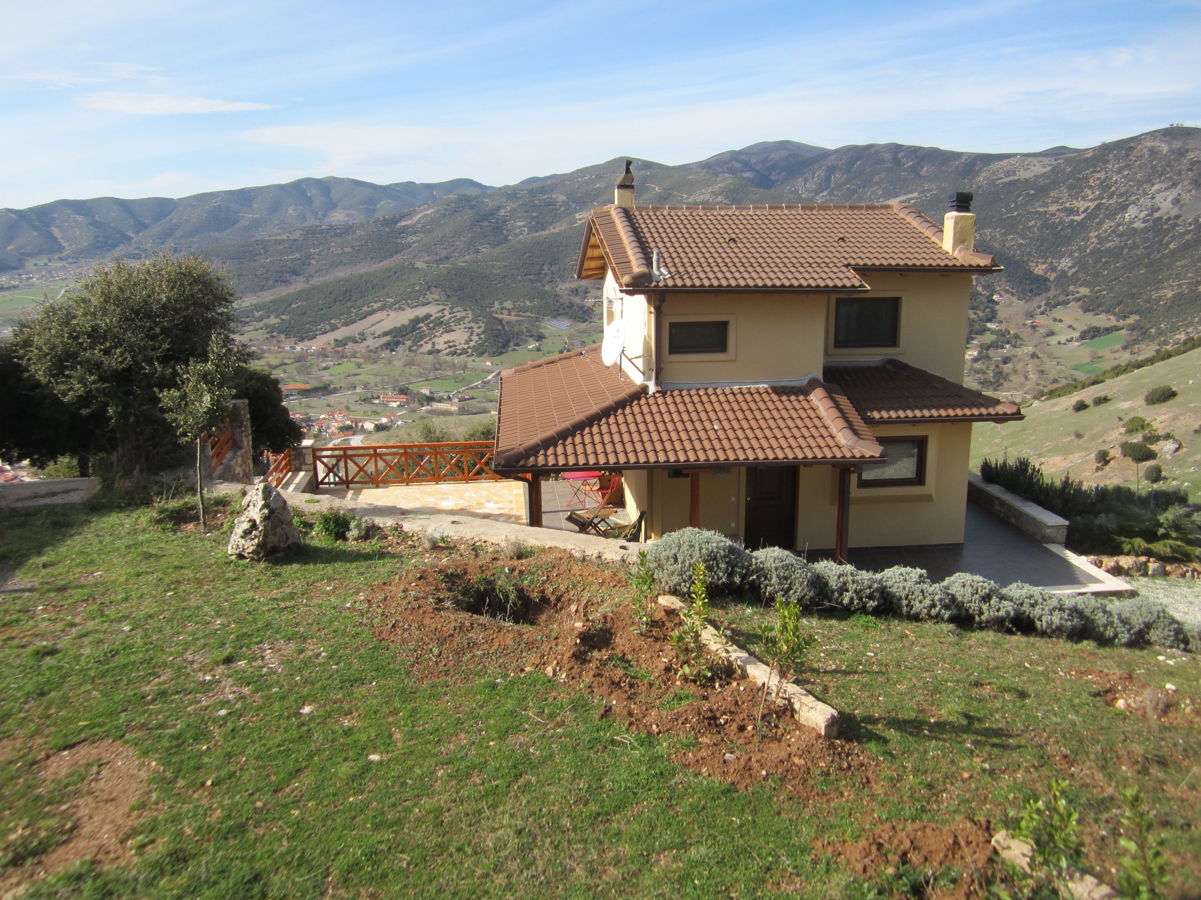 OUR STRONG POINTS - Exceptional location with majestic view- Very important for making your stay especially pleasant in all seasons are the large windows and balcony doors- Construction is designed to provide comfort and affordable luxury- Verandas will give you hours of calm and relaxation, as nothing interferes with the sound of nature- The lodgings are fully equipped and plainly decorated- In case of electric power cut, the building provides a/c generator- There are two separate entrances for the two levels, which allows visitors to come and go independently and meet at will at the middle level sitting room The first level with separate entrance and parking lot, consists of a bedroom with a double bed, a small sitting room with a corner bed-couch and full bathroom.The second level, also with separate main entrance and parking lot, consists of the sitting room, complete with fireplace, open kitchen, WC and a balcony overlooking the town of Kalavryta, the entire valley and the proud mount Erymanthos, which offers majestic sunsets. On the other side, a welcoming veranda with access to the garden overlooks mounts Chelmos and Velias.The third level, is an attic which consists of a large bedroom with a double bed, a smaller one with an oversized mattress on the floor (this way of sleeping is called “stromatsada” in Greece and all children love it), plus a full bathroom.The three levels communicated through an elegant wooden staircase.
